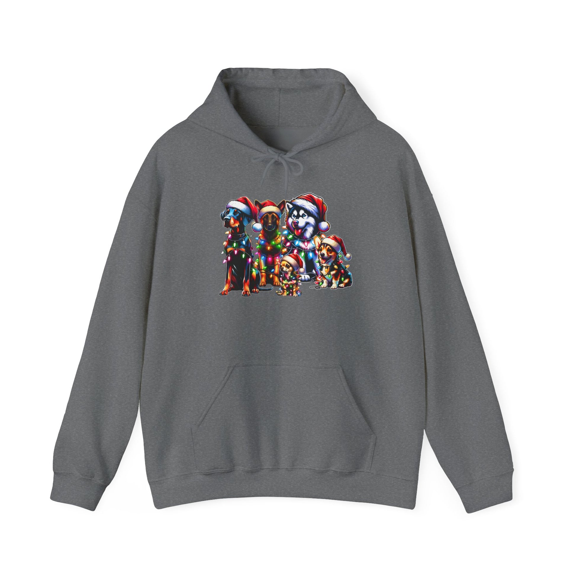 Cozy, cheerful winter hoodie that wraps you in holiday warmth and wagging tails. Soft midweight fleece carries a colorful print of festive dogs wearing Santa hats on the chest, while the back shows a joyful wreath and a circular holiday sentiment. The roomy kangaroo pocket, double-lined hood and color-matched drawcord make it comfortable for crisp morning walks, chilly cocoa nights, or relaxed gatherings with friends and family. This hoodie wears like a warm memory — playful, familiar, and full of seasonal spirit.