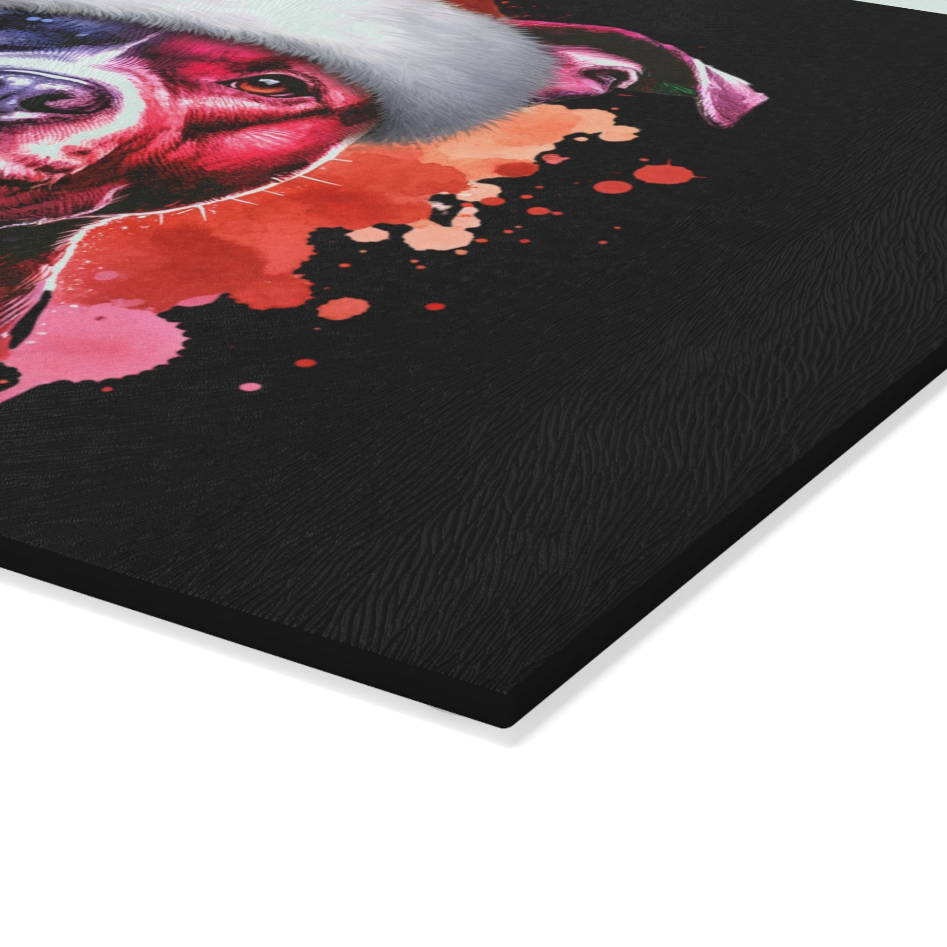 Bright, durable tempered glass cutting board featuring a bold, painterly pit bull wearing a festive Santa hat. The artwork uses vivid, splashy colors that pop against a dark background, giving the board an artistic, modern look that feels both playful and refined. The textured tempered glass surface is sanitary and easy to wipe clean. Small rubber feet hold the board steady on counters while protecting surfaces. Comes in two sizes to suit smaller prep tasks or larger meal preparations. Hand-wash recommended to keep the print crisp and vibrant.