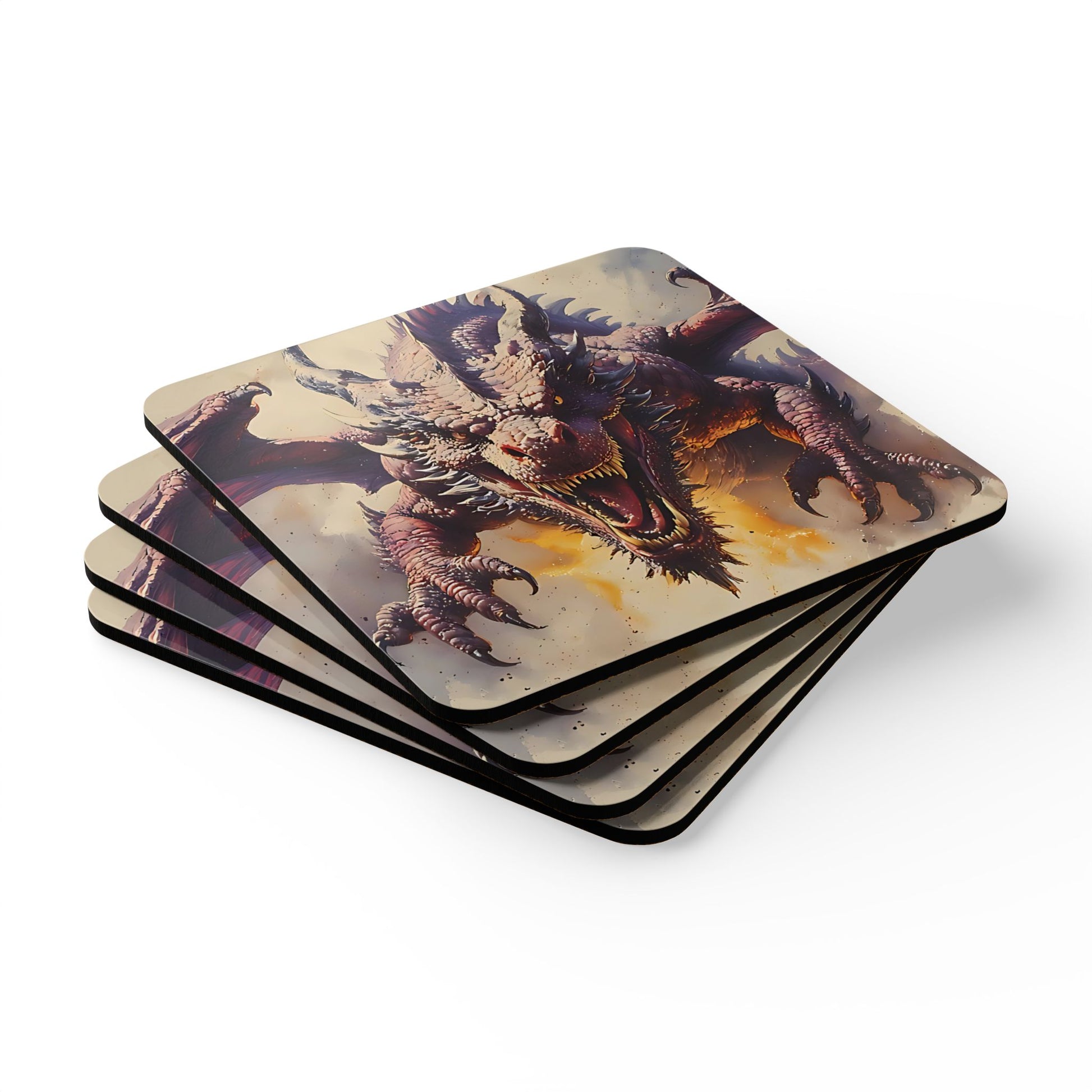Bring a burst of fantasy and fierce personality to your tabletop with this set of four glossy cork-backed coasters. Each 3.75" square features vivid, high-resolution art printed on an MDF top that resists fading and adds a polished shine. The natural cork backing grips surfaces to prevent sliding and protects furniture from heat and moisture. These coasters sit comfortably on a coffee table during game nights, on a desk beside a battle map, or under a mug while you lose track of time in a good book. The dragon artwork adds drama and character without overpowering the room—an easy way to make everyday moments feel a little more epic.