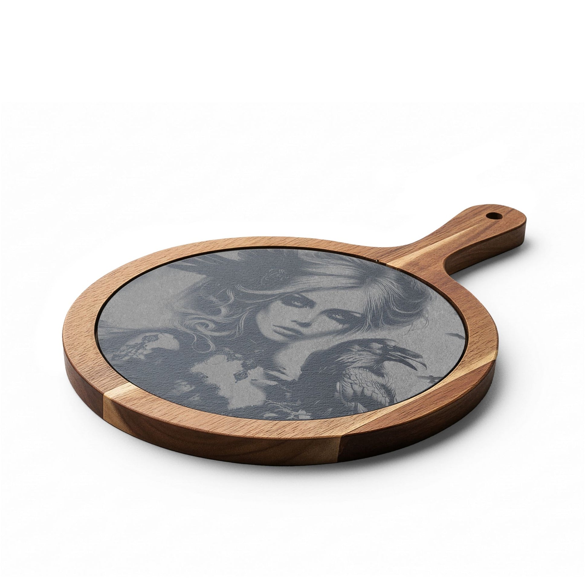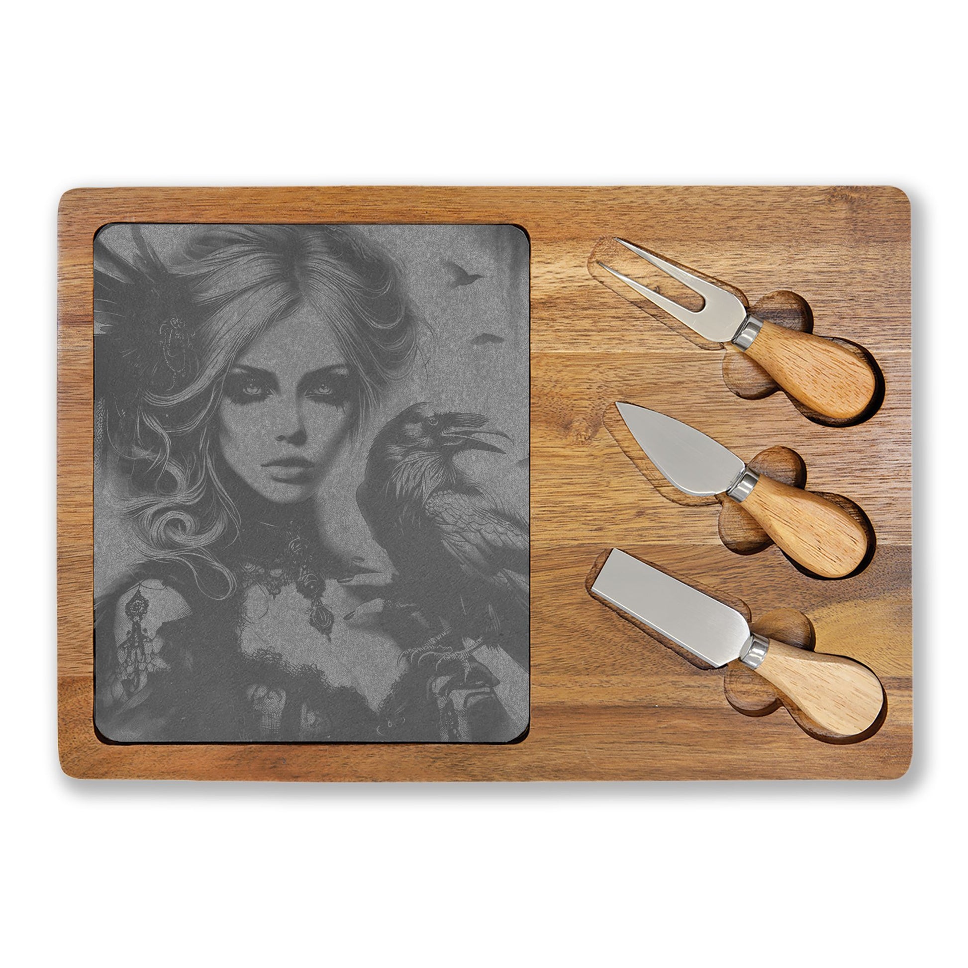 Engraved Acacia Charcuterie Board with Cheese Knives — Gothic Portrait Design