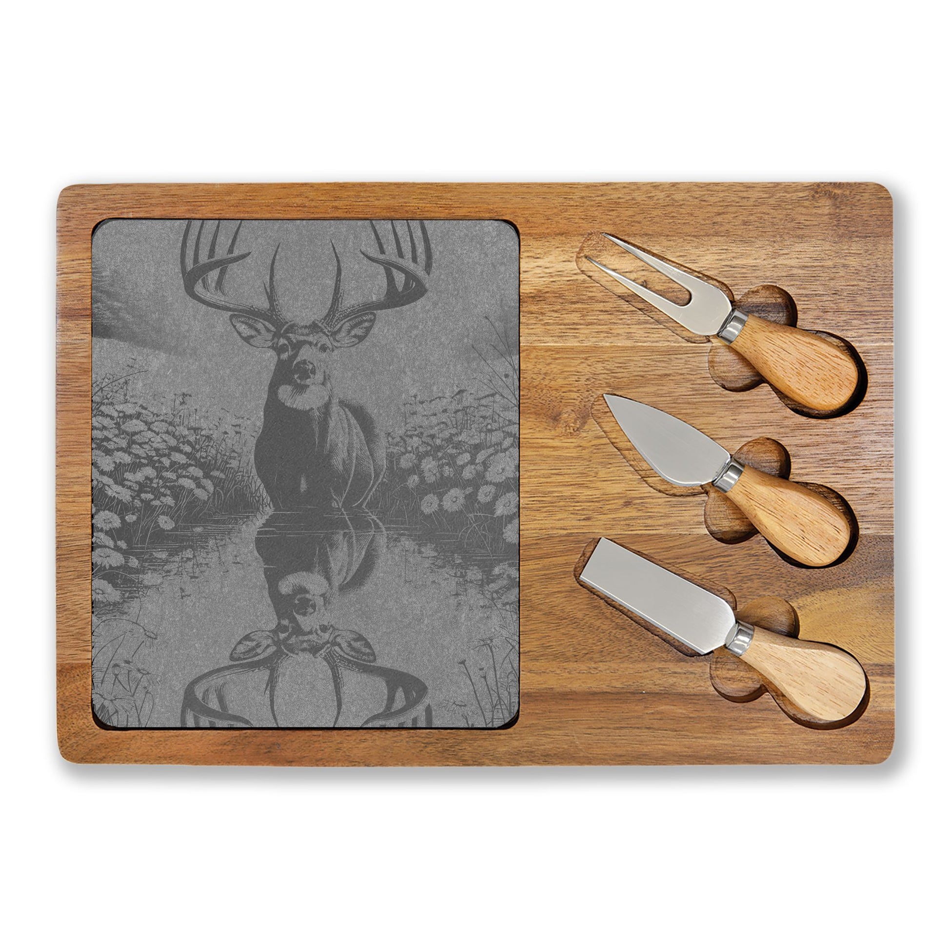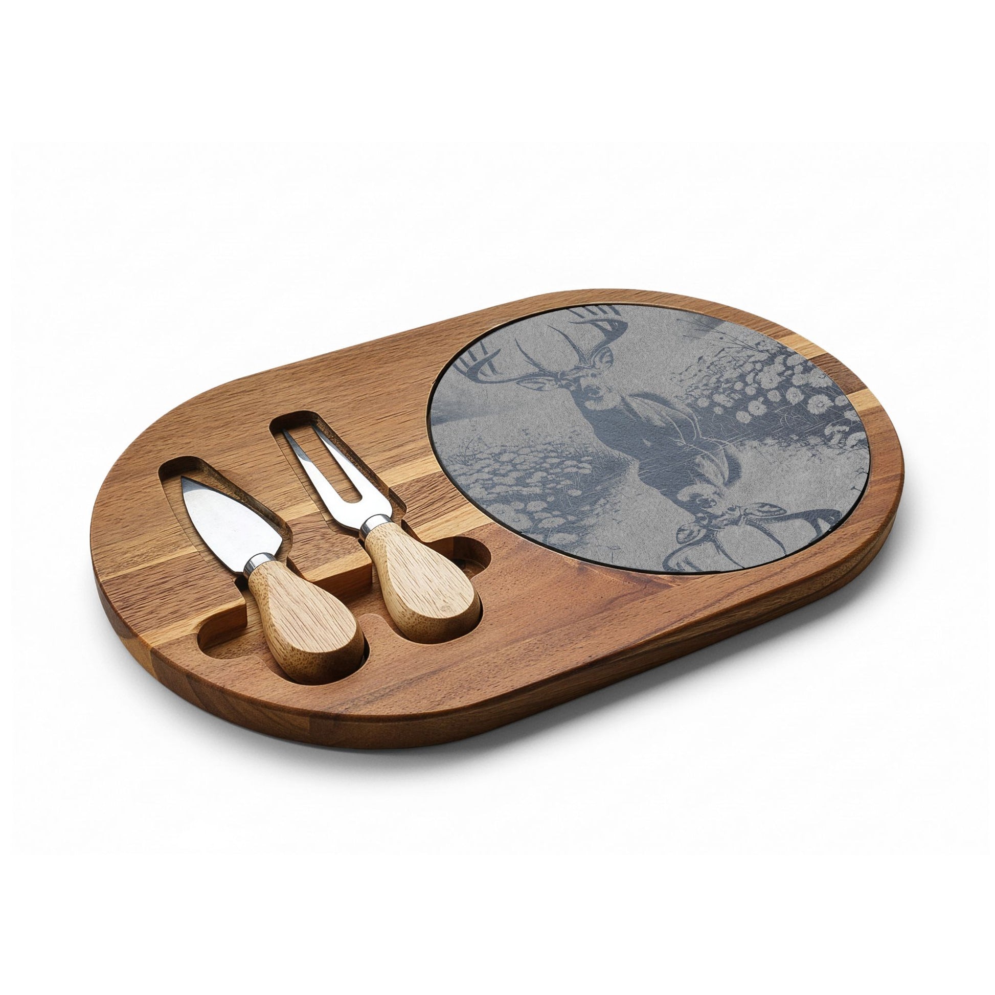 This handcrafted acacia and slate charcuterie board brings warm wood grain and cool stone together for a rustic, refined serving experience. The removable round slate surface is laser-engraved with a subtle stag motif that etches to a soft light-grey contrast, adding personality without overwhelming the table. Two matching cheese knives nest neatly in carved slots for tidy storage and easy presentation. Use it to set the mood for cozy evenings at the cabin, relaxed game-day spreads, or intimate gatherings where thoughtful details matter. The board is finished for durability and long-term use; care with hand washing preserves the wood and engraved slate for years of entertaining.