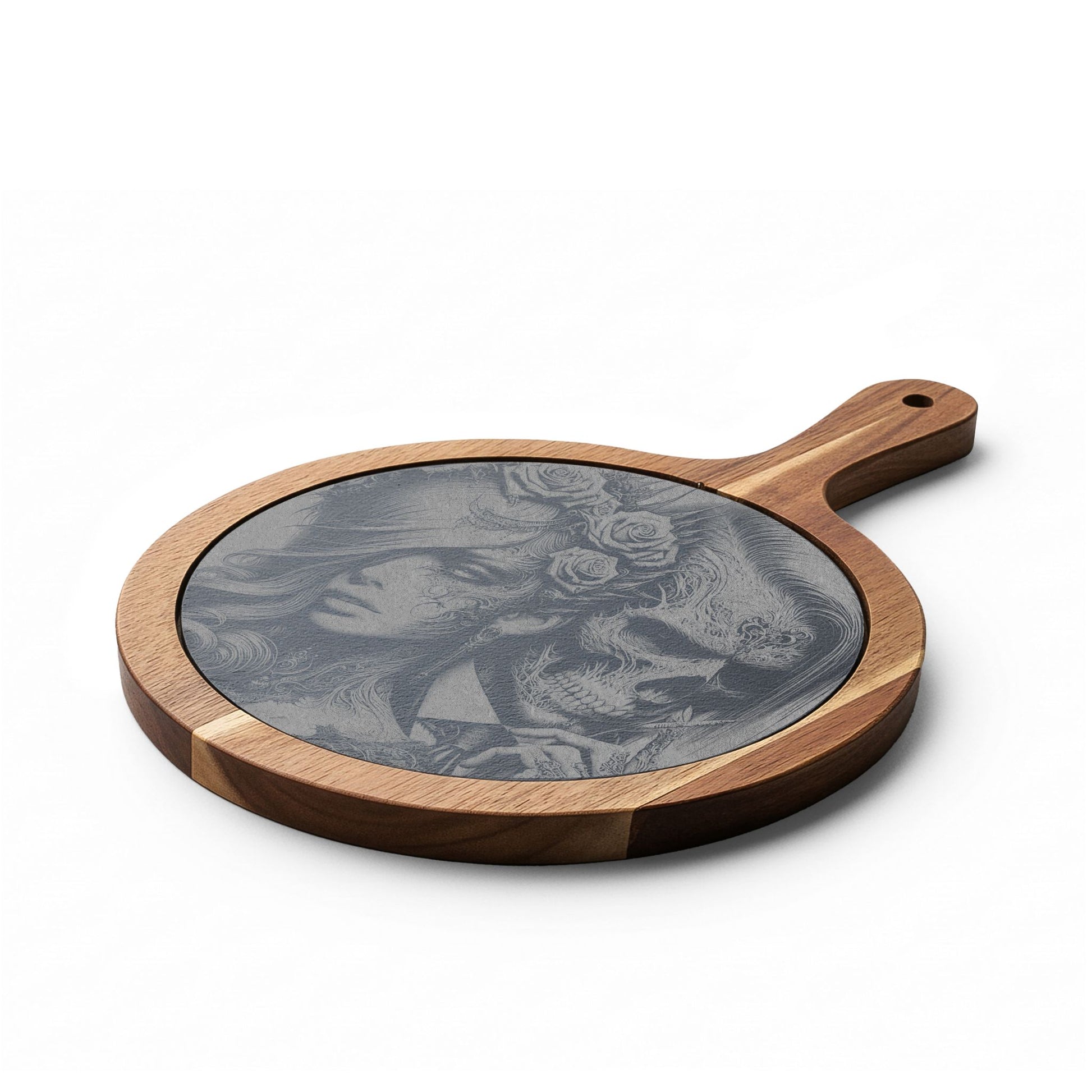 A handcrafted acacia and slate charcuterie board that blends rustic warmth with moody artistry. The removable slate surface is laser-engraved to a soft grey, creating a striking contrast against the warm acacia grain. Two built-in slots hold the included bamboo-handled cheese knives for an organized, elegant presentation. This board wears everyday wear with dignity — serve cheeses, cured meats, and small bites straight from the plank, then remove the slate for easy engraving display. Note: hand wash only to preserve wood and slate finish.