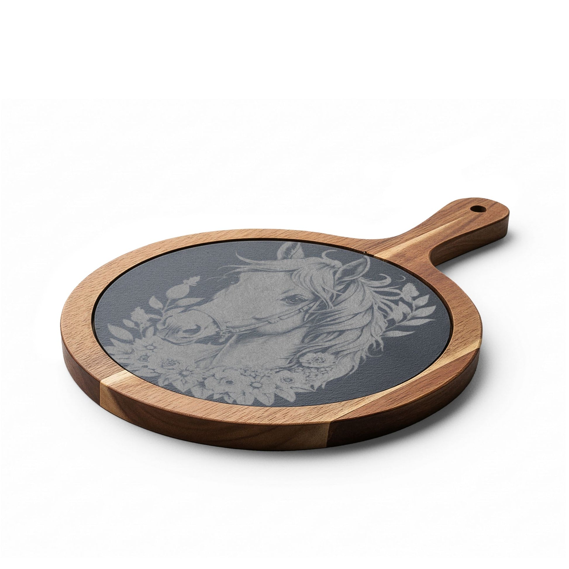 Engraved Horse Cheeseboard Set — Acacia Charcuterie Board with Slate Inlay & Cheese Tools