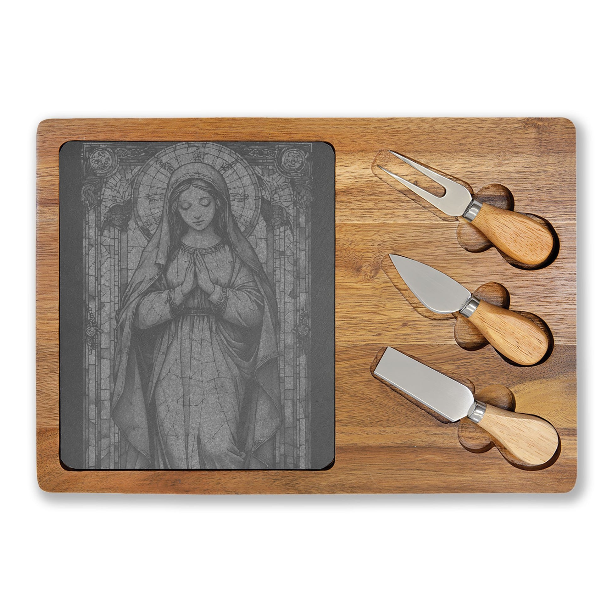 Engraved Virgin Mary Charcuterie Board with Marble Inlay — Religious Cheese Serving Set