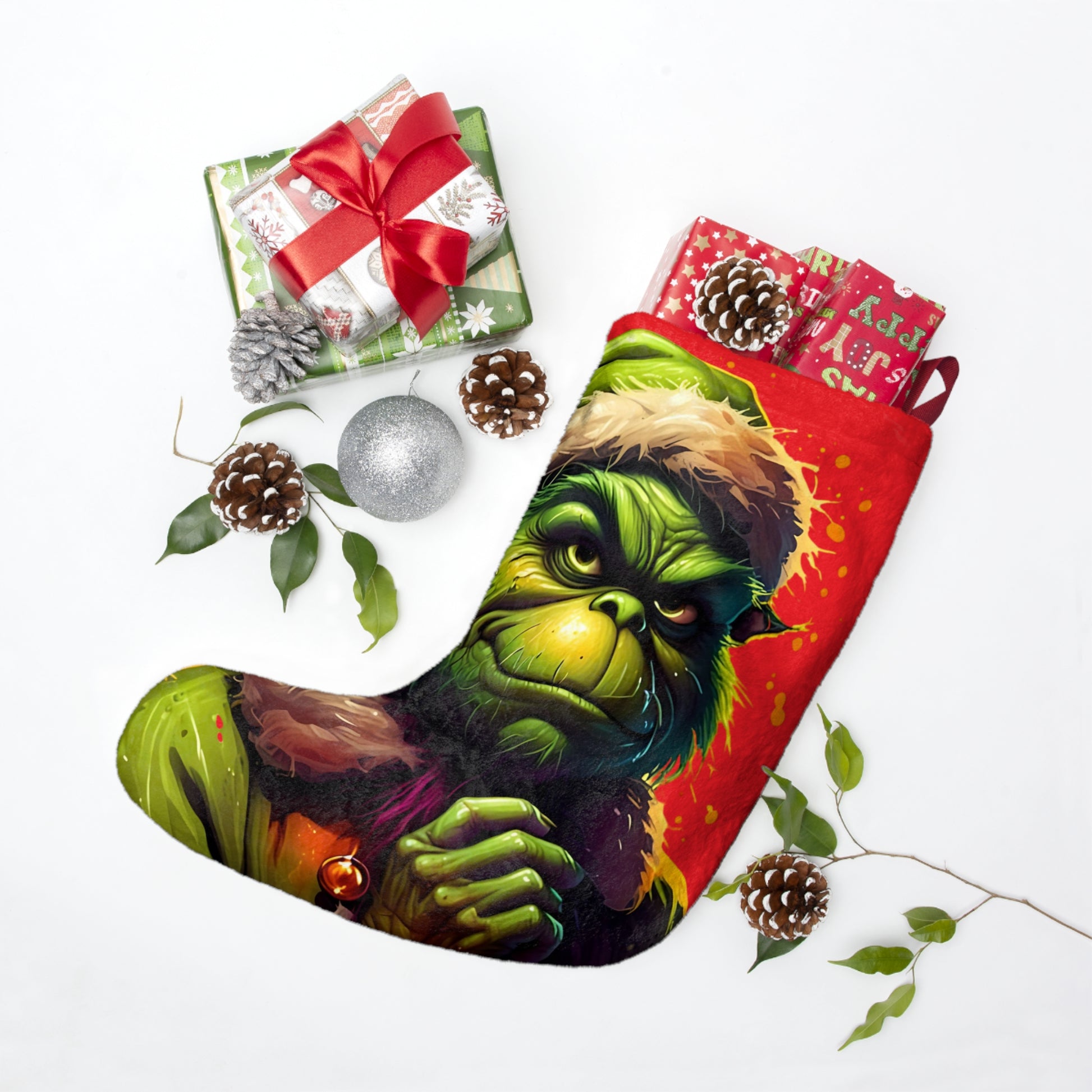 A bold, playful stocking that brings mischievous holiday energy to any mantel. Plush polyester fleece wraps a vivid print of a scheming green character in a Santa hat — bright reds and greens that pop against soft, velvety texture. The roomy interior swallows oversized surprises and small treats alike, while a sturdy twill loop keeps it hanging proud. This stocking reads like a wink from the holidays: fun, a little cheeky, and built to last season after season. It works as a statement piece for homes that lean into quirky, pop-culture, or subversive seasonal décor, and slips seamlessly into a lively, color-forward holiday setup.