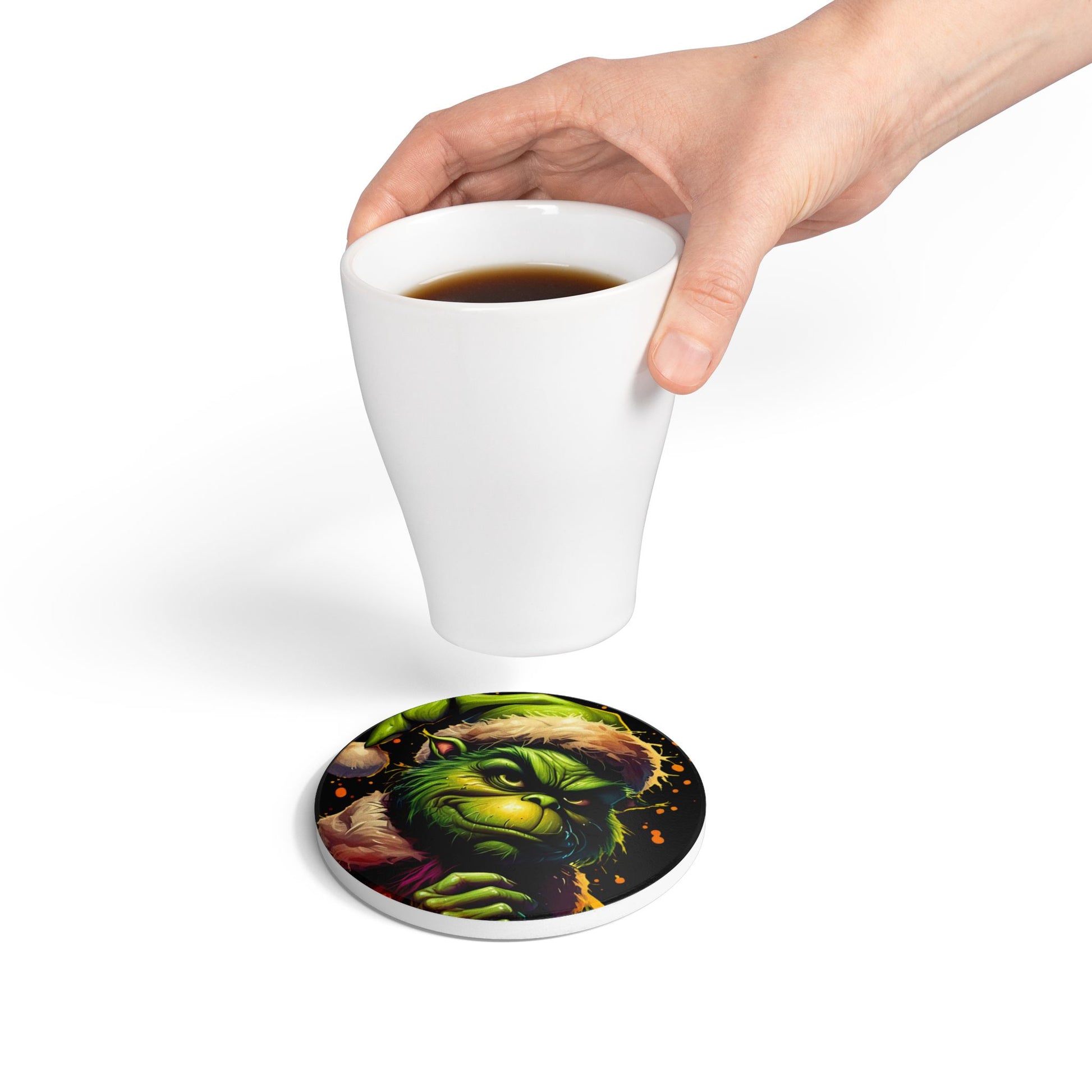 A bold ceramic coaster that brings mischievous holiday energy to any mug or glass. The thick white ceramic top showcases a vivid, full-color portrait of a grinning green character in a Santa hat — saturated tones and fine detail that pop against dark backgrounds. A natural cork backing keeps the coaster steady on wood and glass, protecting surfaces from heat marks and condensation. Sized to fit most cups, this durable coaster wipes clean easily and stands up to daily use while adding a playful, slightly wicked twist to seasonal gatherings, cozy nights in, or an eclectic tabletop display.