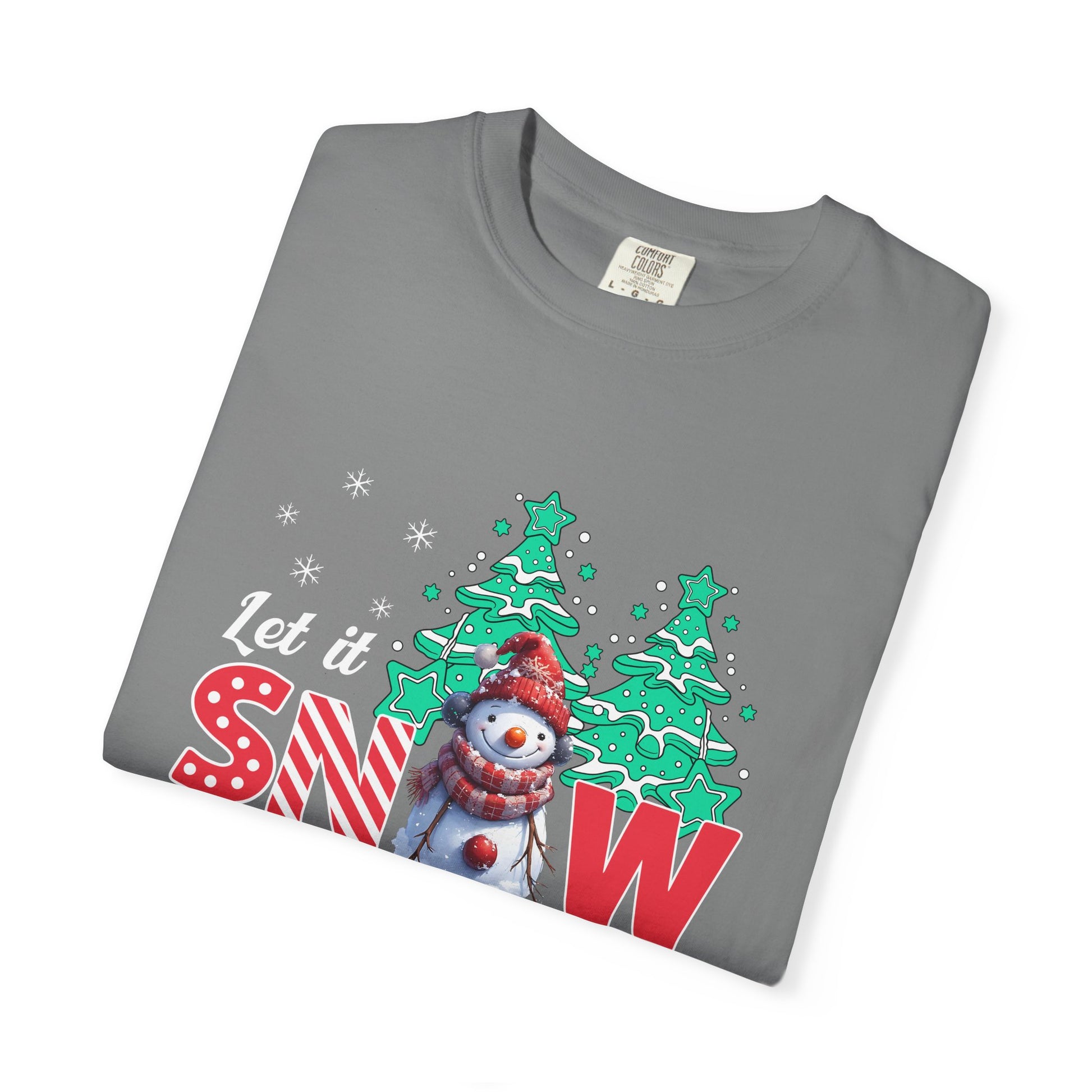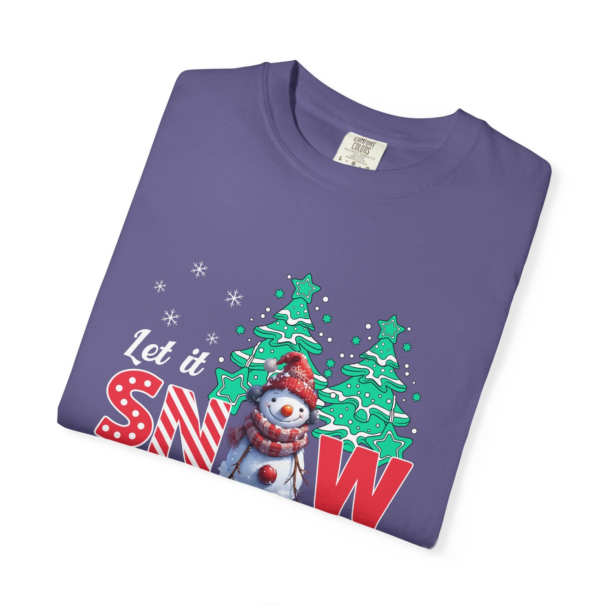 This relaxed-fit garment-dyed tee brings playful winter attitude to everyday wear. A cheerful snowman and two fir trees frame bold, playful lettering that reads “Let it SNOW… somewhere else,” giving the shirt a tongue-in-cheek holiday vibe that’s more cozy cabin sarcasm than sugary cheer. The midweight cotton feels lived-in from day one thanks to post-construction dyeing and ring-spun fibers. Wear it layered under a flannel for brisk morning errands or alone while sipping coffee by the window and watching the forecast with a smirk. Durable double-needle seams and a tubular, seam-free body keep the silhouette clean and long-lasting, while the sewn-in label and pre-shrunk fabric mean fewer surprises after the first wash. Available in many colors and sizes, this tee fits into a wardrobe that values comfort, character, and a little winter wit.
