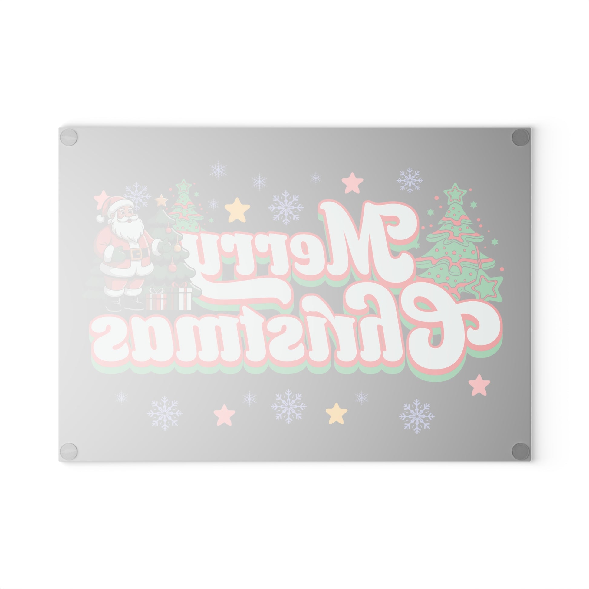 A cheerful tempered-glass cutting board that brings bright, vintage-style holiday charm to everyday prep. The board features a bold “Merry Christmas” design with playful stars, snowflakes, decorated trees and a jolly Santa rendered in crisp, vibrant colors that resist wear thanks to a durable decoration process. The textured tempered glass surface is sanitary and easy to rinse, while four rubber feet keep the board steady on counters. Available in two sizes, it works as a festive prep surface and a display piece when the season calls for extra cheer.