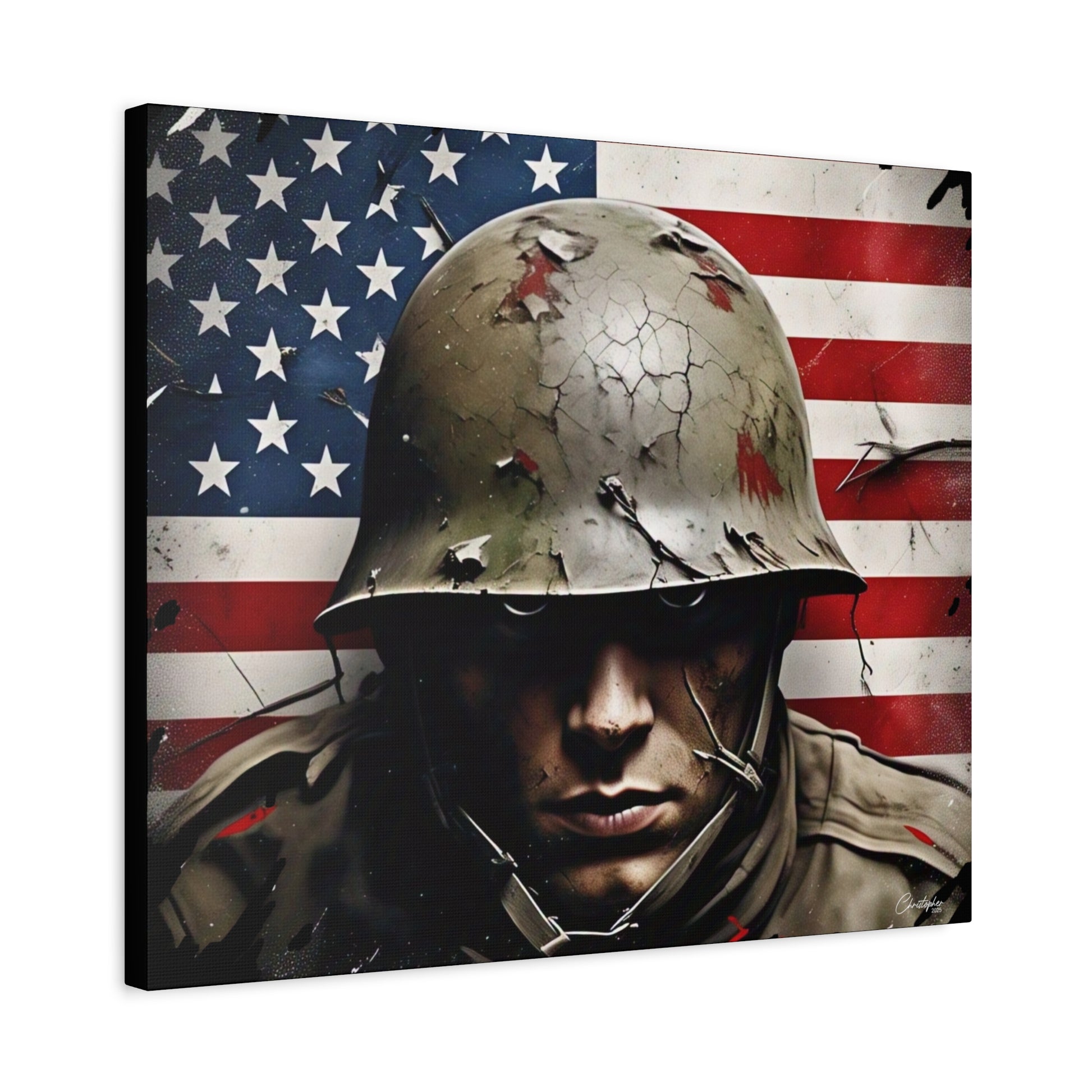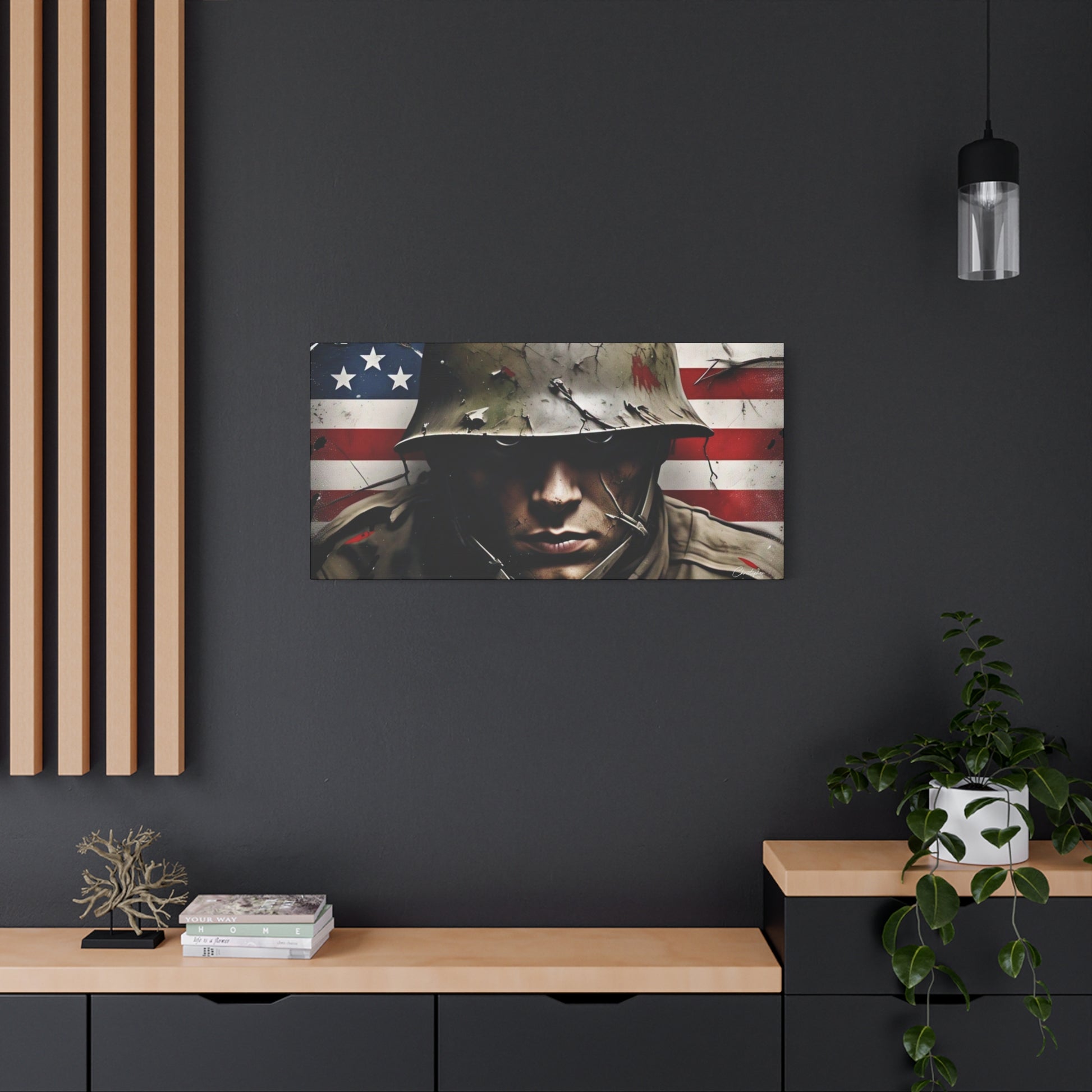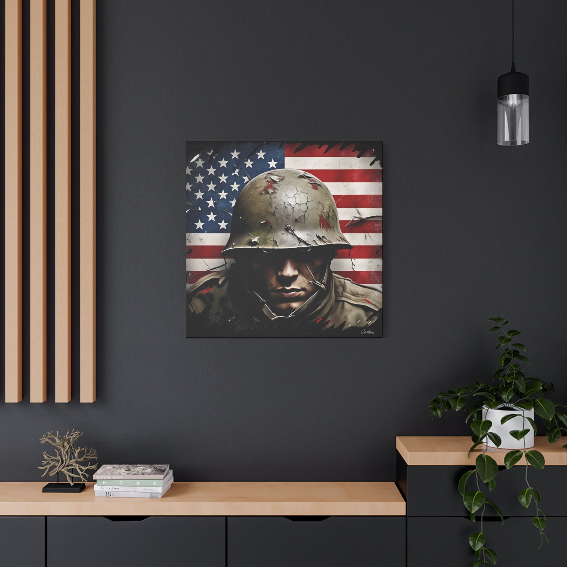 Transform your space with this stunning Matte Canvas, Stretched artwork. Featuring a striking military motif against a backdrop of the American flag, it evokes feelings of bravery and patriotism. Perfect for creating a powerful atmosphere in your home, office, or studio, this canvas enhances any environment with its bold design. Ideal for veterans, military enthusiasts, or anyone who values freedom and history, this piece makes a perfect gift for Memorial Day, Veterans Day, or Independence Day celebrations. Let this artwork be a reminder of courage and commitment in your life.