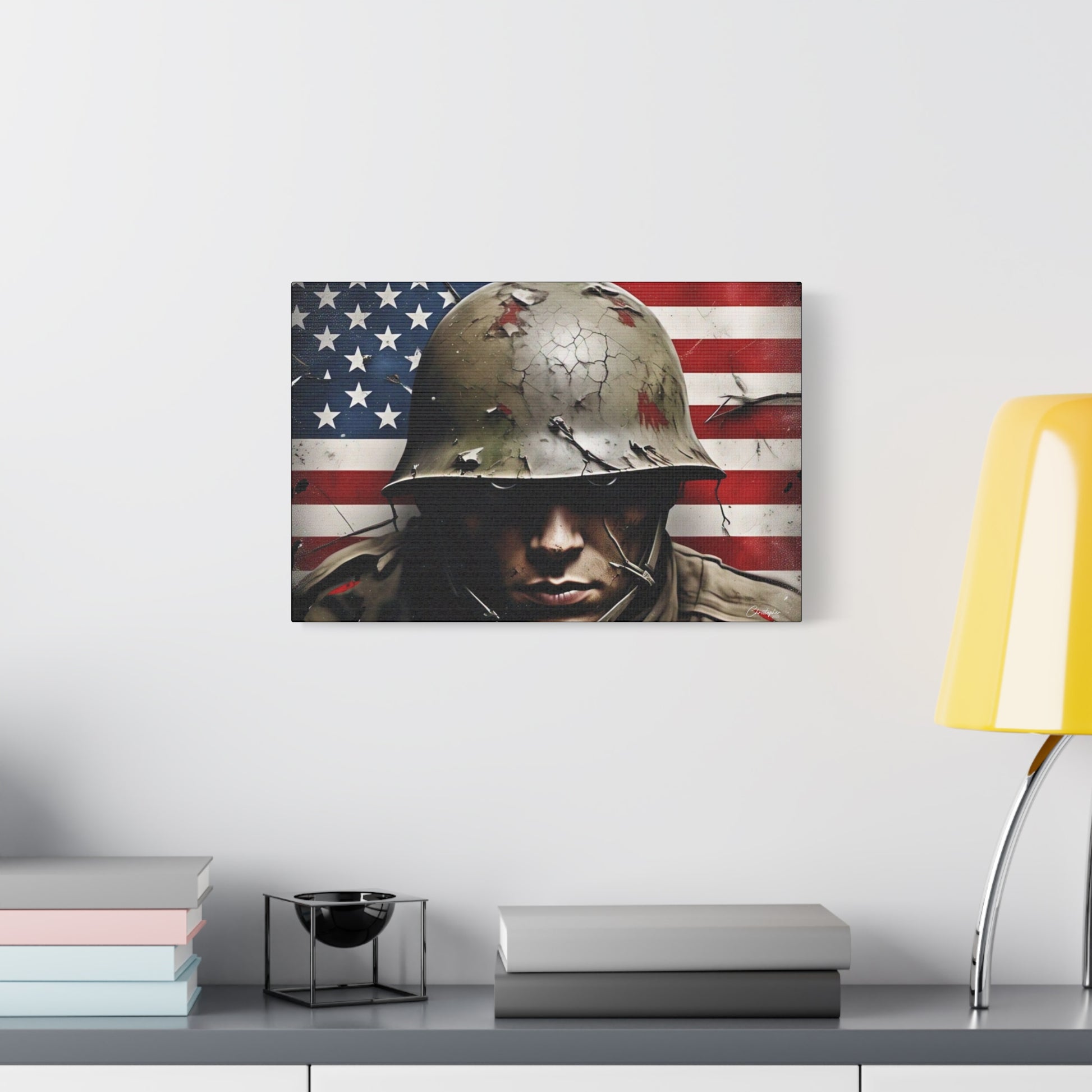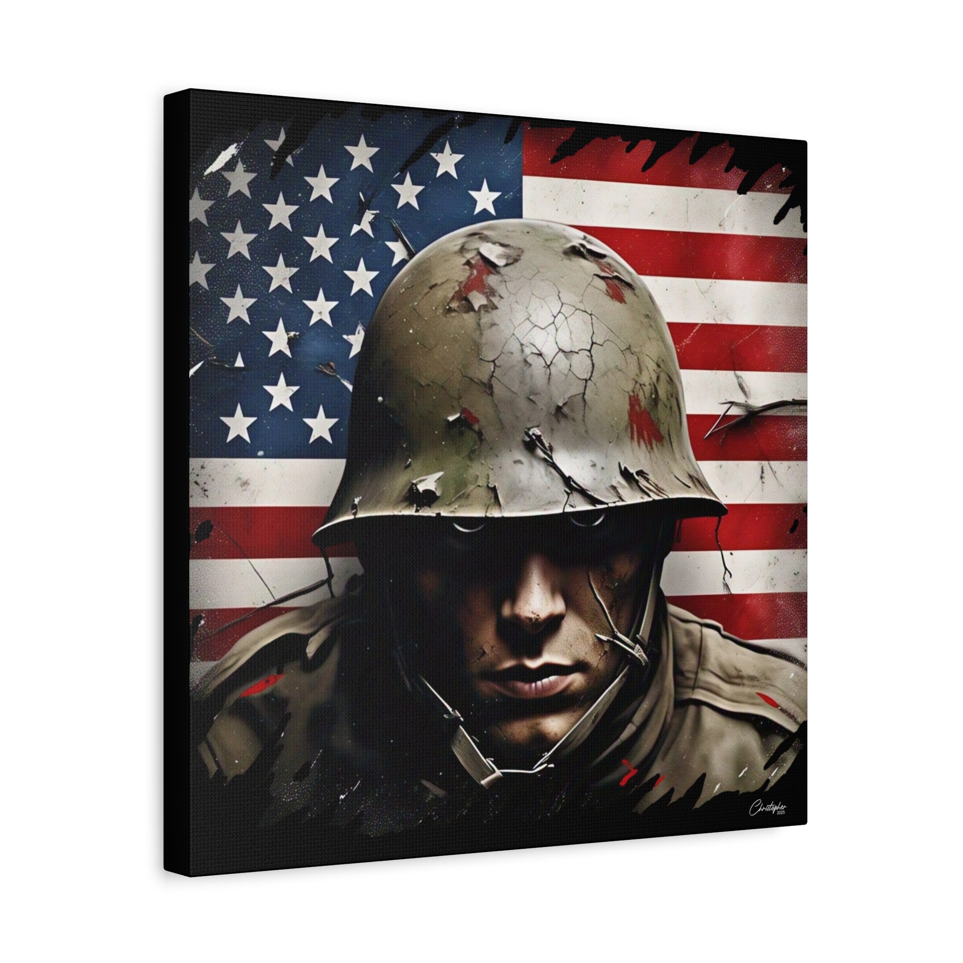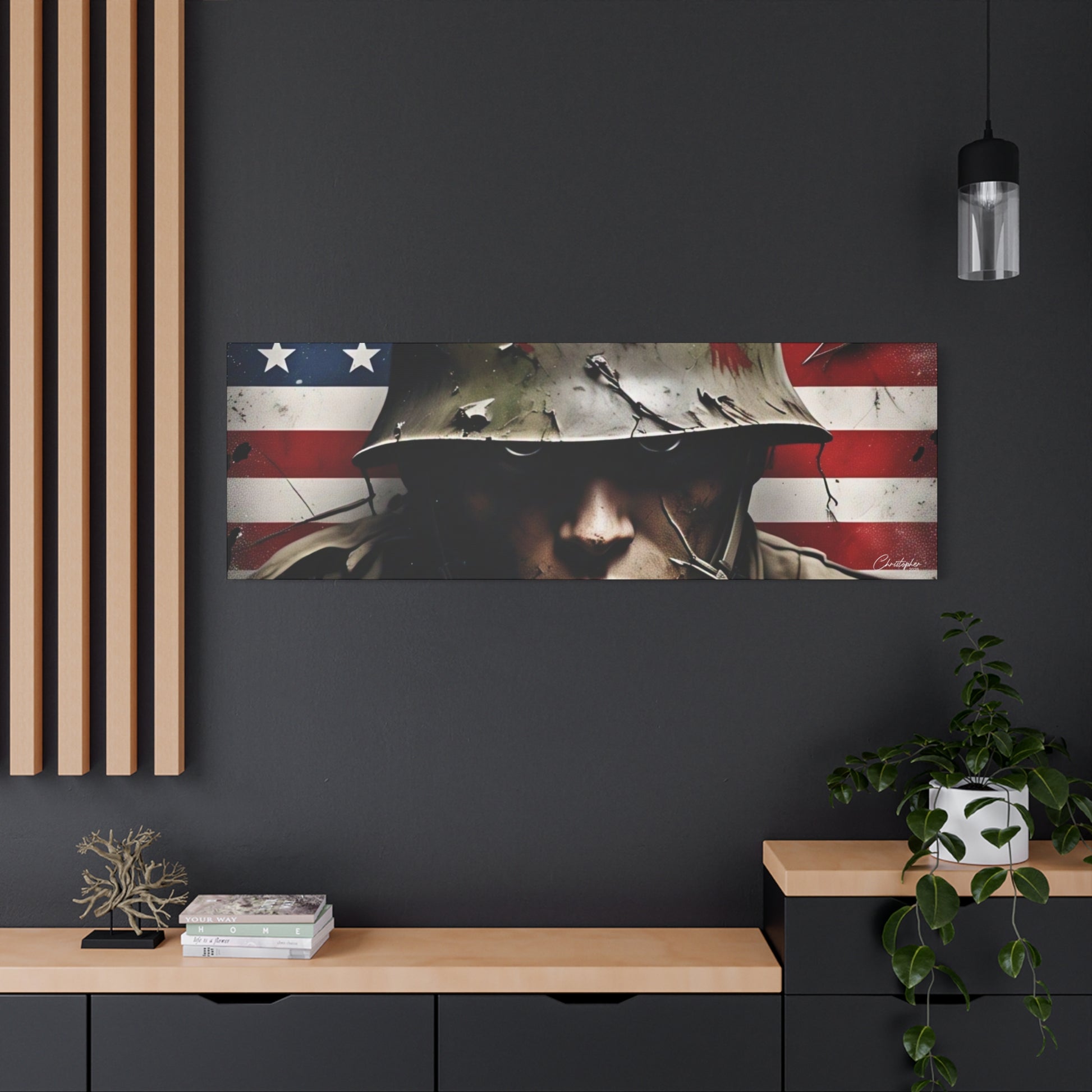Transform your space with this stunning Matte Canvas, Stretched artwork. Featuring a striking military motif against a backdrop of the American flag, it evokes feelings of bravery and patriotism. Perfect for creating a powerful atmosphere in your home, office, or studio, this canvas enhances any environment with its bold design. Ideal for veterans, military enthusiasts, or anyone who values freedom and history, this piece makes a perfect gift for Memorial Day, Veterans Day, or Independence Day celebrations. Let this artwork be a reminder of courage and commitment in your life.