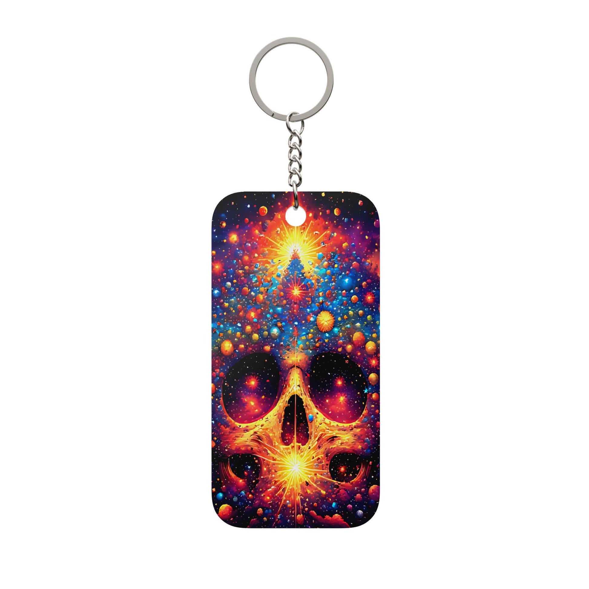 Carry a tiny portal to the cosmos wherever you go. This acrylic keychain charm features a vibrant, double-sided print of a luminous, psychedelic skull surrounded by multicolored starlike orbs. The imagery feels electric — equal parts mystic and bold — inviting quick grins from fellow travelers and late-night commuters alike. Lightweight and glossy, it hangs from a short chain and ring, turning ordinary keys or bag zippers into a personal statement that hints at adventure, late-show energy, and a love for vivid, imaginative art.