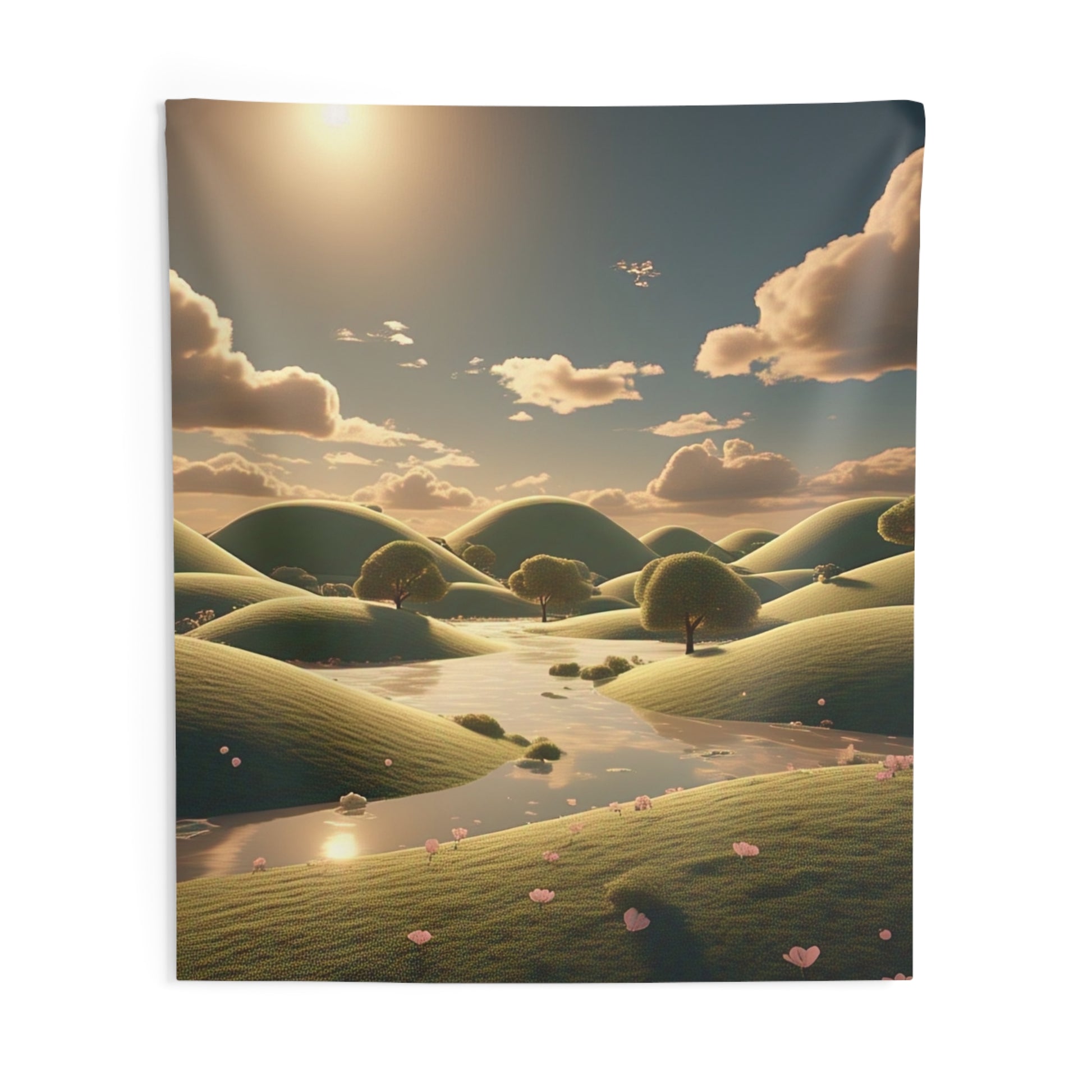 Soft, sunlit hills roll into a quiet, dreamlike valley. This indoor wall tapestry wraps a room in golden afternoon light, gentle clouds, and a slow river that catches the sun. It feels like stepping into a calm memory: warm air on your skin, petals drifting across the grass, and a single tree standing watch. Hang it above a bed, beside a reading nook, or behind a low sofa to create a peaceful corner for unwinding, meditating, or getting lost in daydreams.