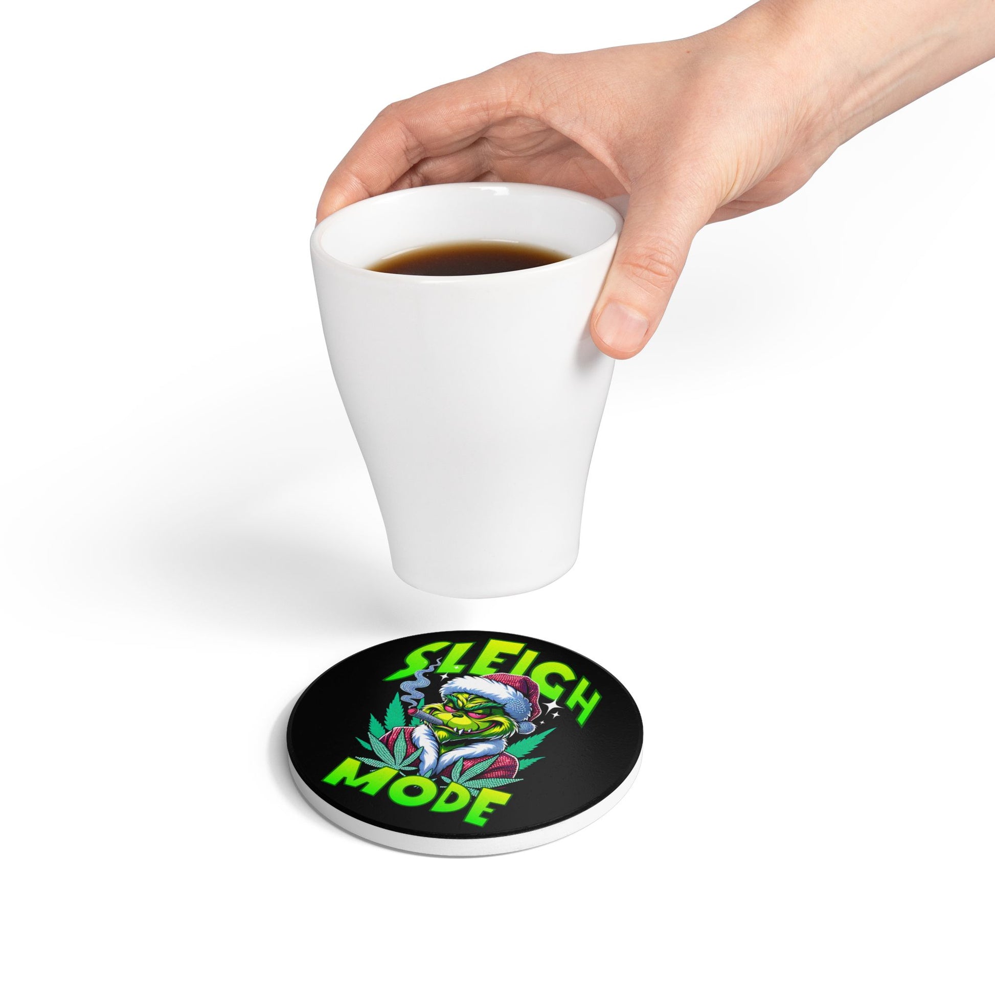 A bold ceramic coaster stamped with a playful, edgy holiday design that balances cheeky humor and laid-back vibes. The image shows a grinning, Santa-hat-wearing grinch-like character surrounded by stylized cannabis leaves and the neon-green text “SLEIGH MODE.” On a deep black background, the bright colors pop and give this coaster a cheeky, counterculture holiday energy. It sits flat on a cork-backed base, ready to protect surfaces from hot mugs, frosty glasses, and the odd accidental ring. This coaster fits into relaxed, irreverent holiday setups — living room movie nights, chill hangouts, and festive sessions where friends trade jokes and playlists instead of white lights. Durable ceramic resists stains and wipes clean easily; the cork underside keeps cups steady and tables safe. It’s the kind of small, graphic accent that sparks a laugh when guests sit down and sets a playful tone for the whole gathering.