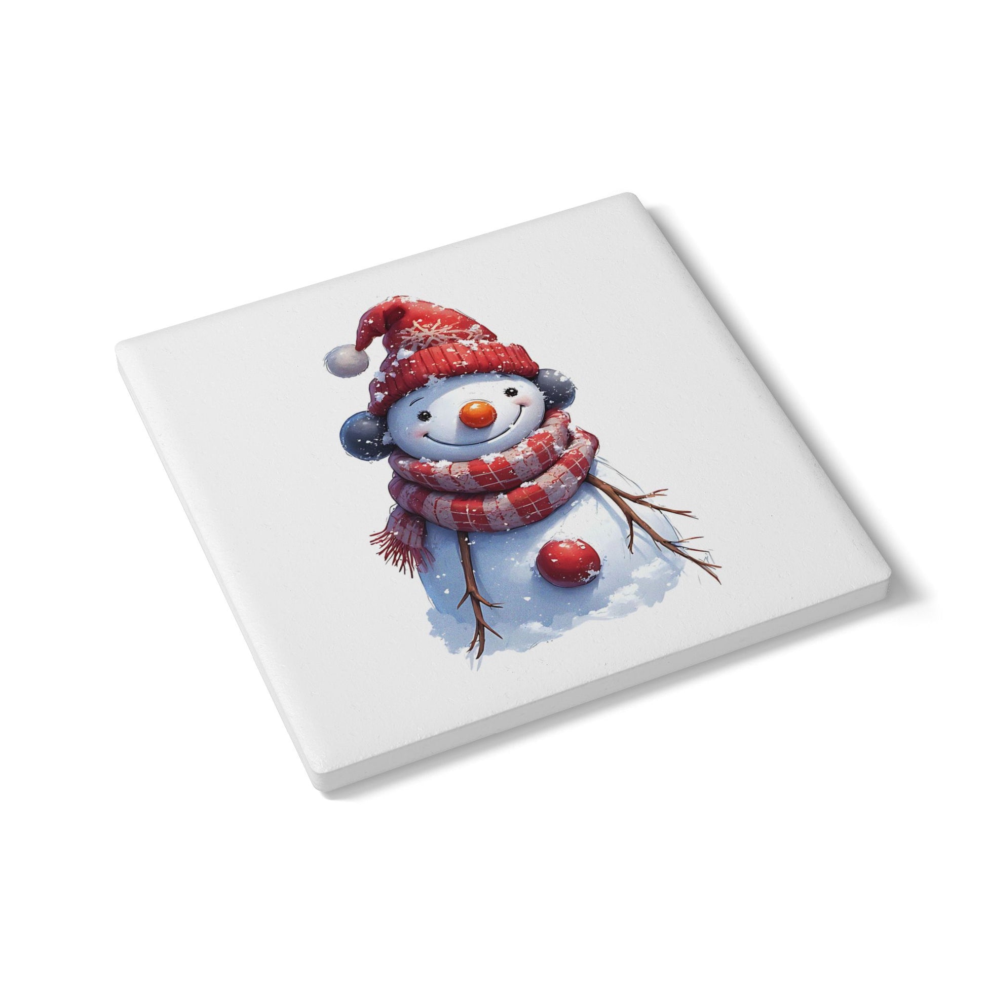 A cheerful ceramic coaster adorned with a charming watercolor snowman in a cozy red hat and striped scarf. The smooth white ceramic top showcases the delicate winter illustration with soft snowfall details, while the cork underside keeps surfaces safe from slips and moisture. Compact and easy to wipe clean, this coaster holds both hot and cold drinks and brings a warm, nostalgic touch to festive gatherings, quiet mornings by the window, or a holiday tea break.