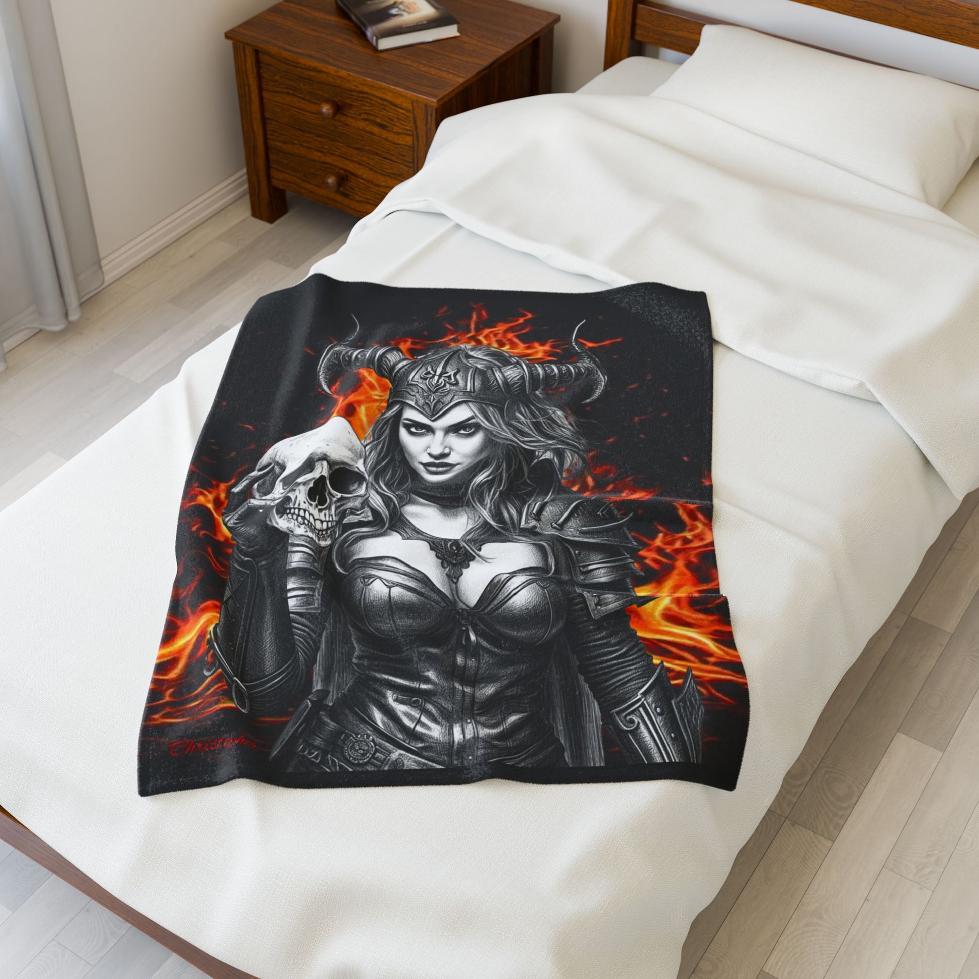 Valkyrie Skull Velvet Plush Blanket — Fiery Gothic Throw for Fantasy & Viking Fans