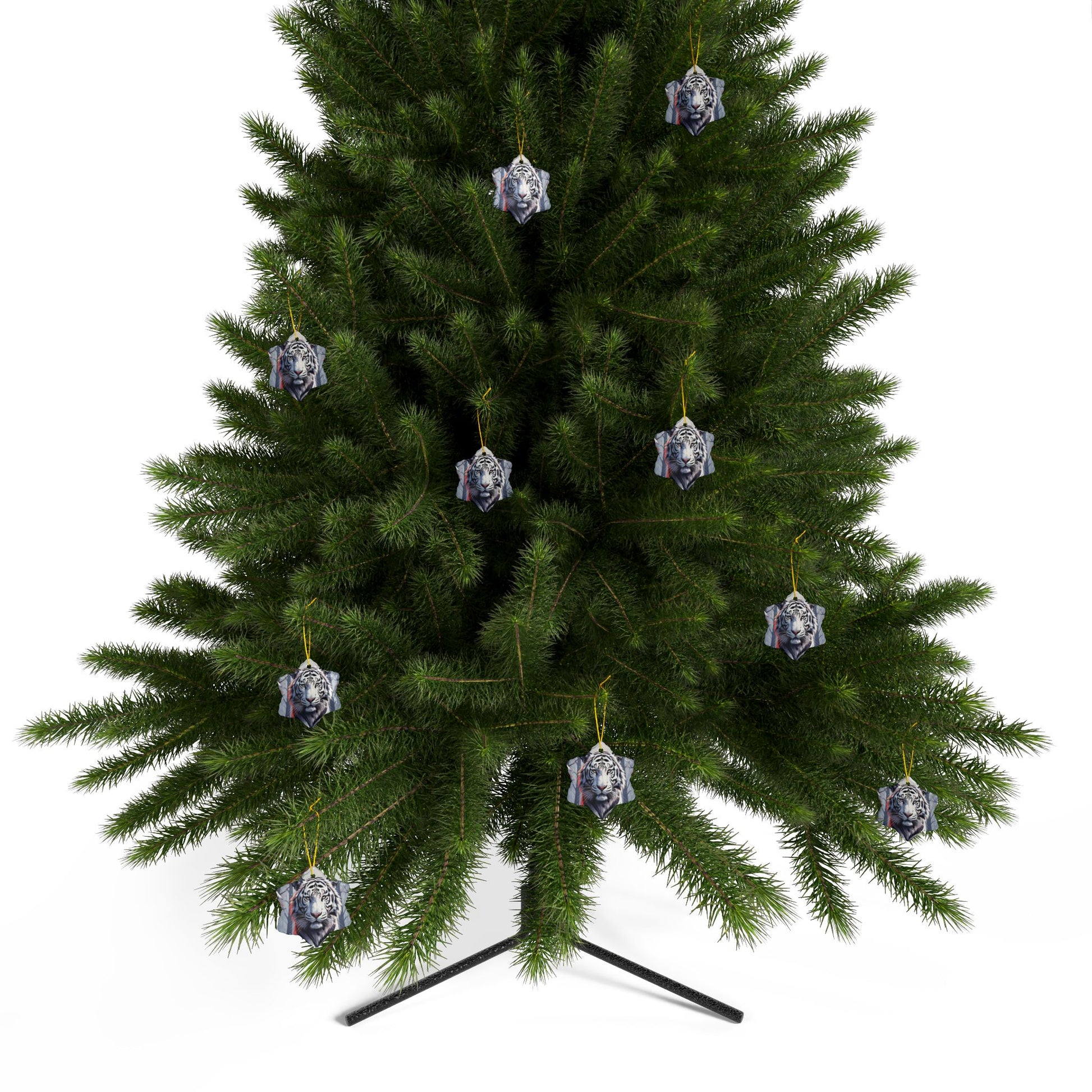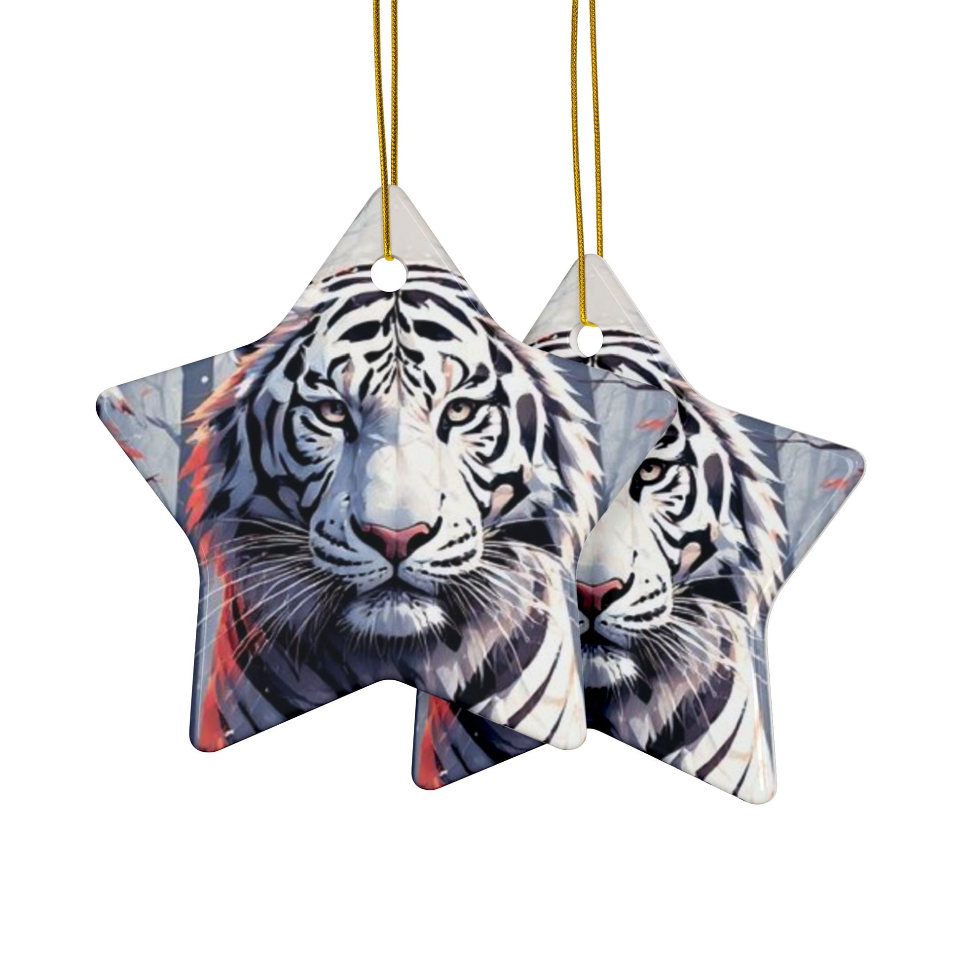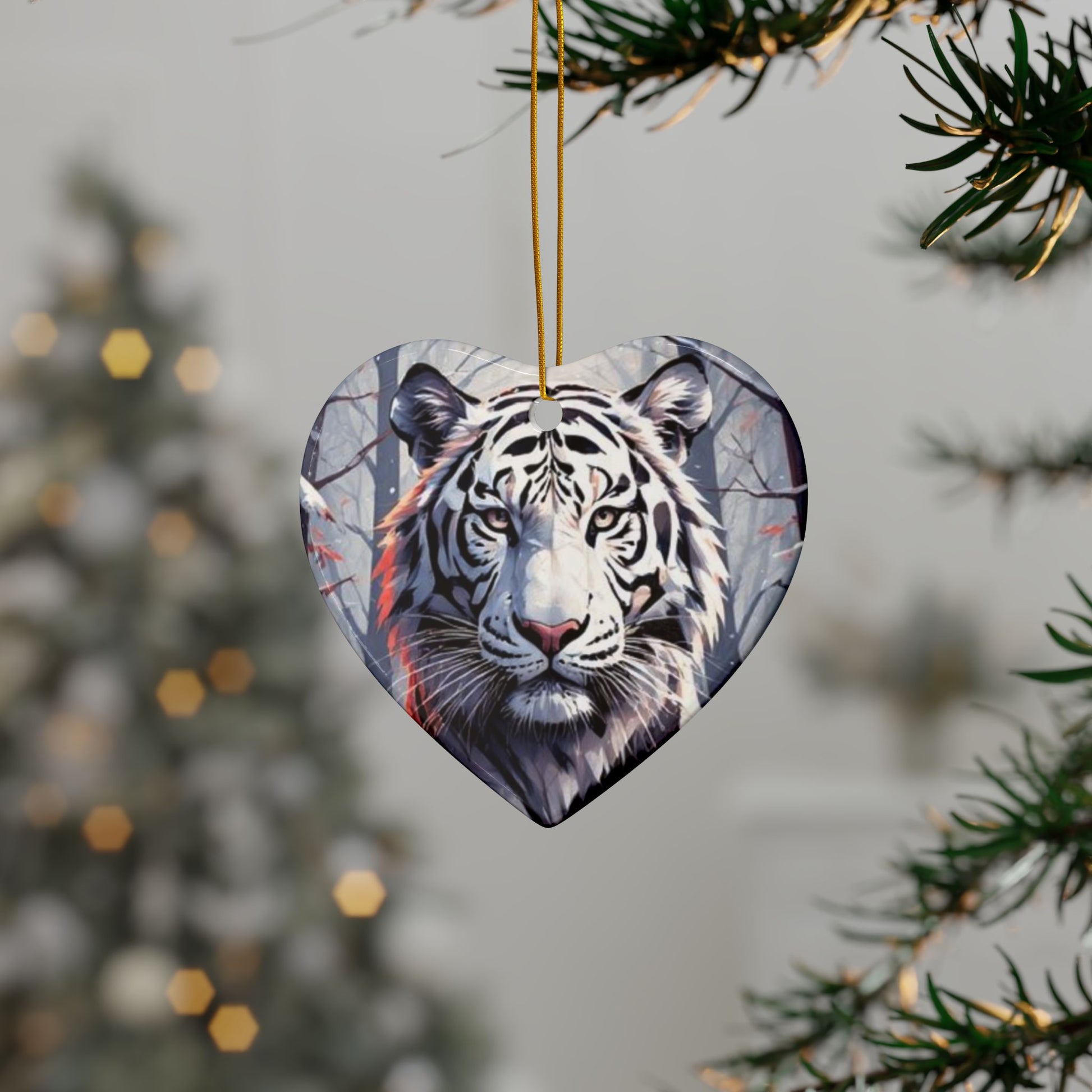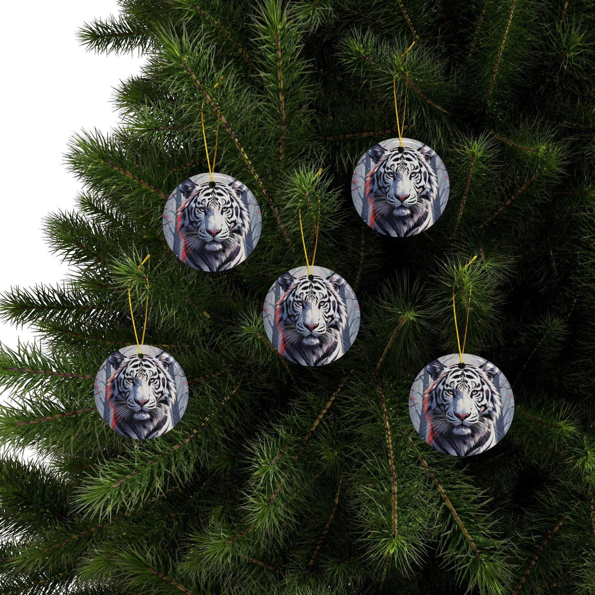 A glossy ceramic ornament that brings bold, wintry energy to any space. This double-sided round ornament features a striking white tiger illustration with cool, frosted blues and subtle warm accents — the kind of image that stops you mid-step. Hung by the included gold string, it catches light and draws the eye whether it hangs from a tree, a window, or a cozy corner hook. The sturdy ceramic body and crisp full-color print hold up season after season, keeping that fierce, serene presence on display through holiday gatherings, cabin weekends, or quiet evenings at home.