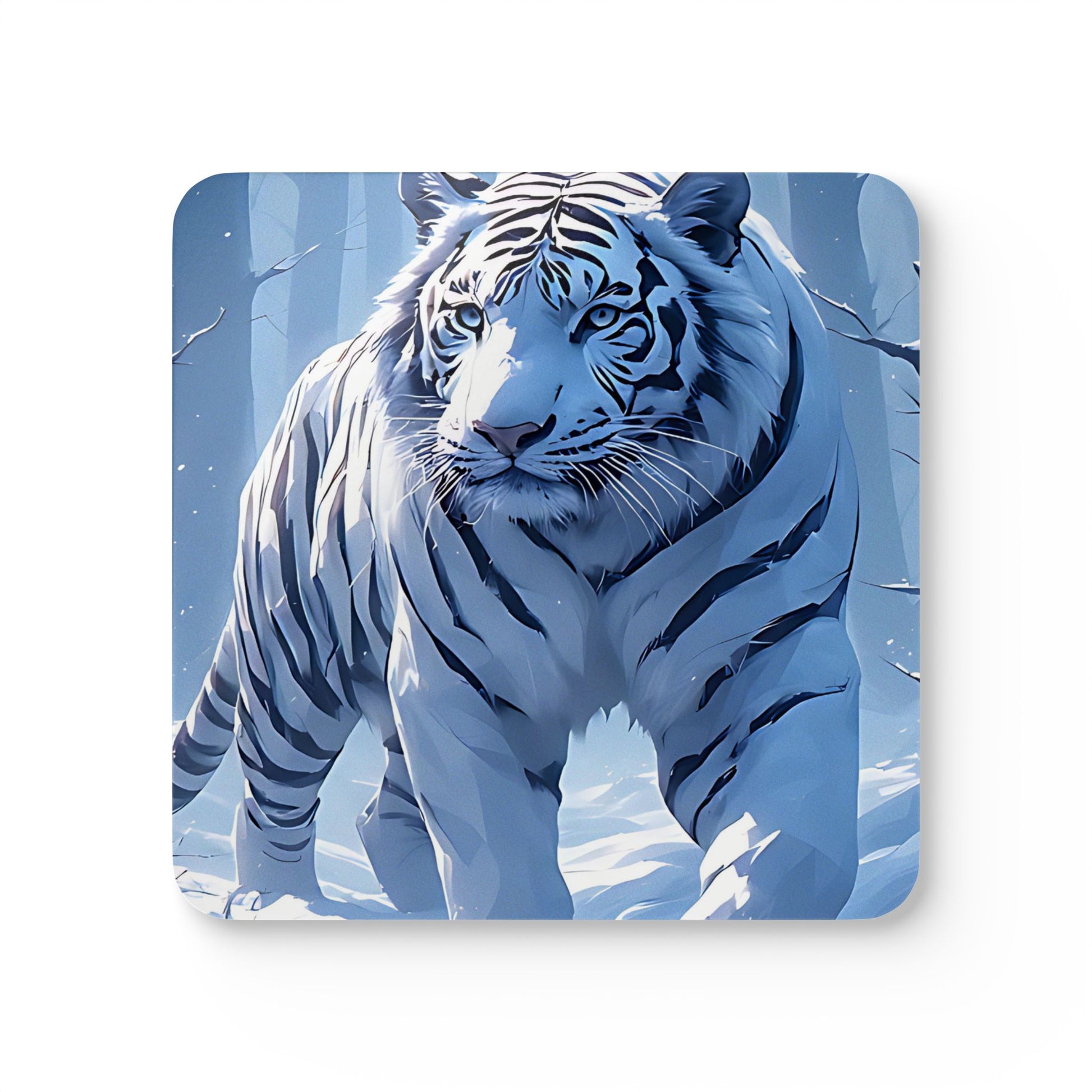 White Tiger Cork Coaster Set — Illustrated Winter Wildlife Drink Coasters (4-Pack)