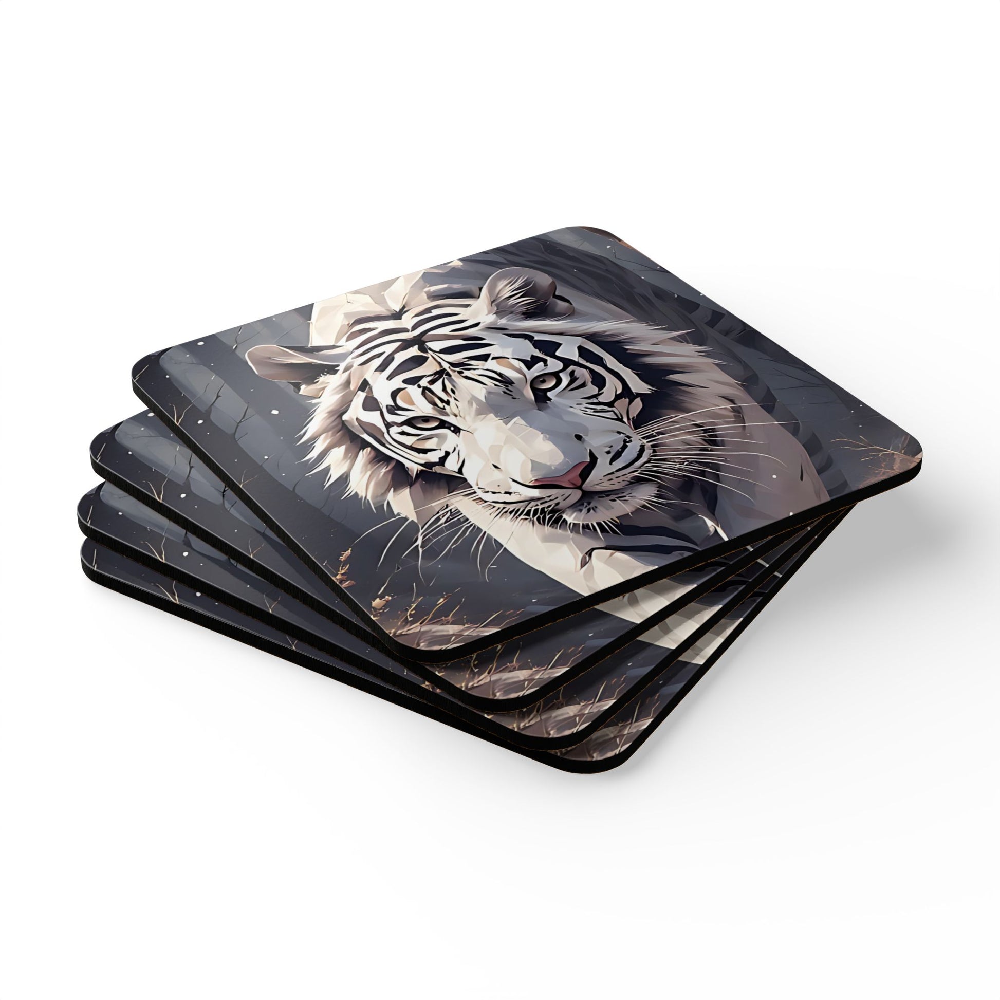 Bring a quiet, fierce presence to your coffee table with this Corkwood coaster set. Each 3.75" square carries a glossy, full-color print of a snow-white tiger prowling through a dim forest — a design that feels both calm and powerful. The high-gloss MDF top makes the artwork sing while a cork backing grips surfaces and protects wood from rings and slips. These coasters settle into slow mornings and late-night reading sessions, the kind of small detail that reflects someone who values atmosphere and thoughtful objects.