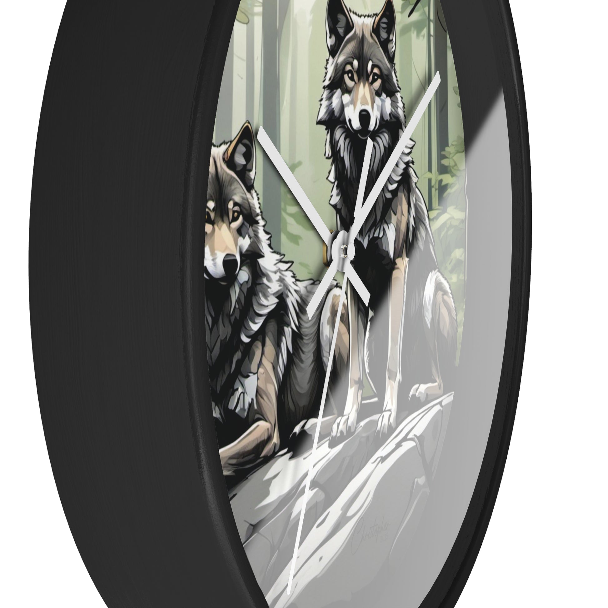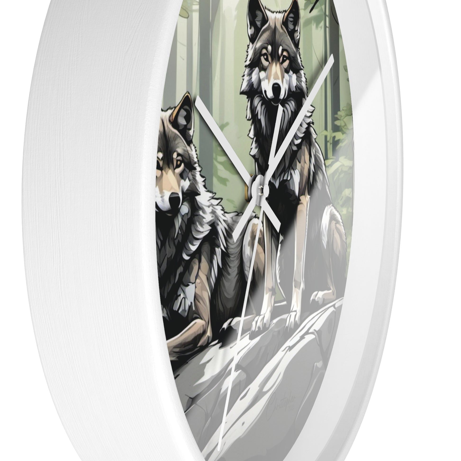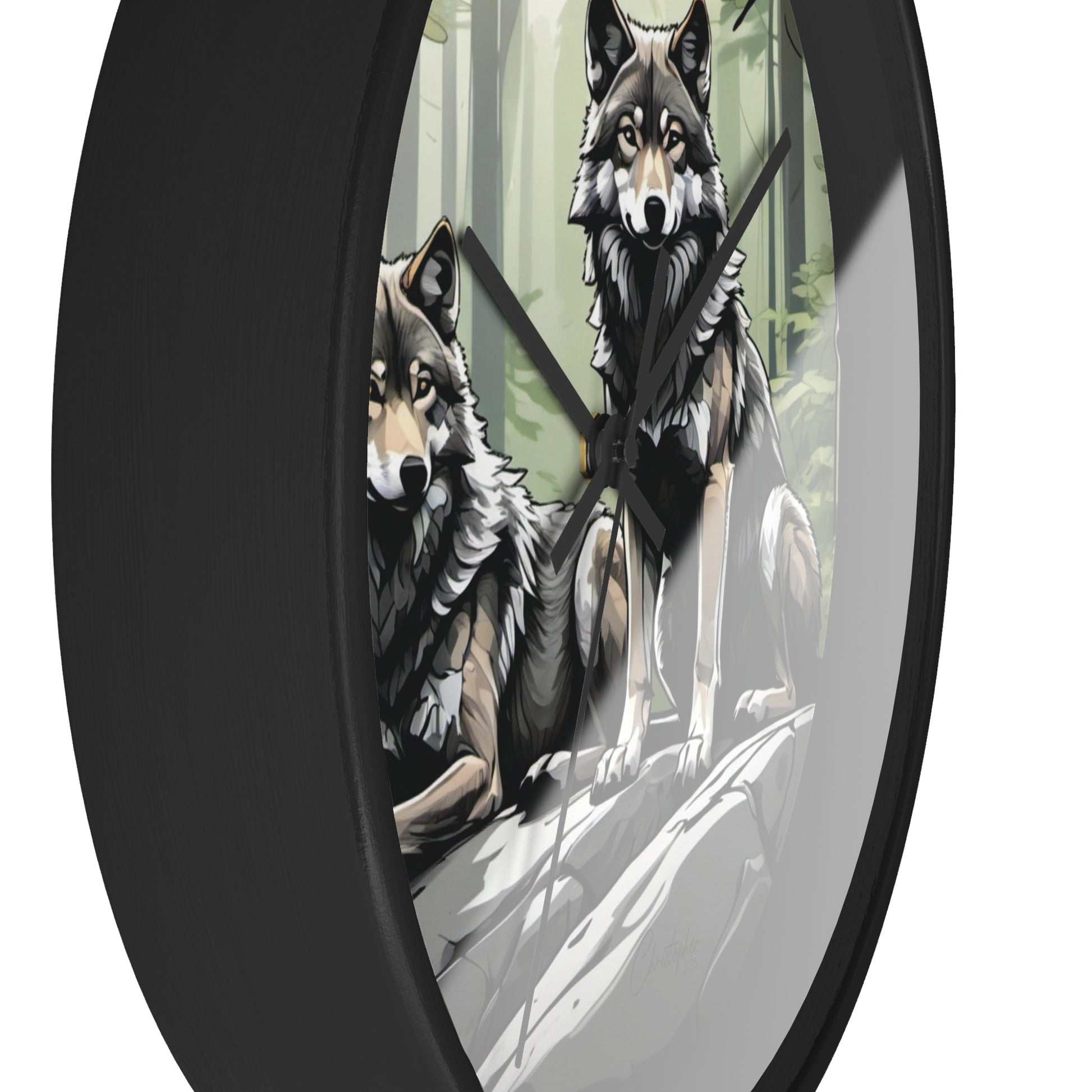 Enhance your living space with this stunning wall clock, designed to make a statement while keeping you punctual. Featuring vibrant artwork of two majestic wolves amid a serene forest backdrop, this clock radiates a cool, tranquil vibe that brings nature indoors. Its rich details and vivid colors create an eye-catching focal point in any room, perfect for nature lovers and wildlife enthusiasts alike. Ideal for decorating your living room, bedroom, or home office, it serves as a wonderful gift for housewarmings, birthdays, or holidays such as Earth Day and Christmas. Its timeless design fits seamlessly into both rustic and modern decor, making it a versatile addition to any home.