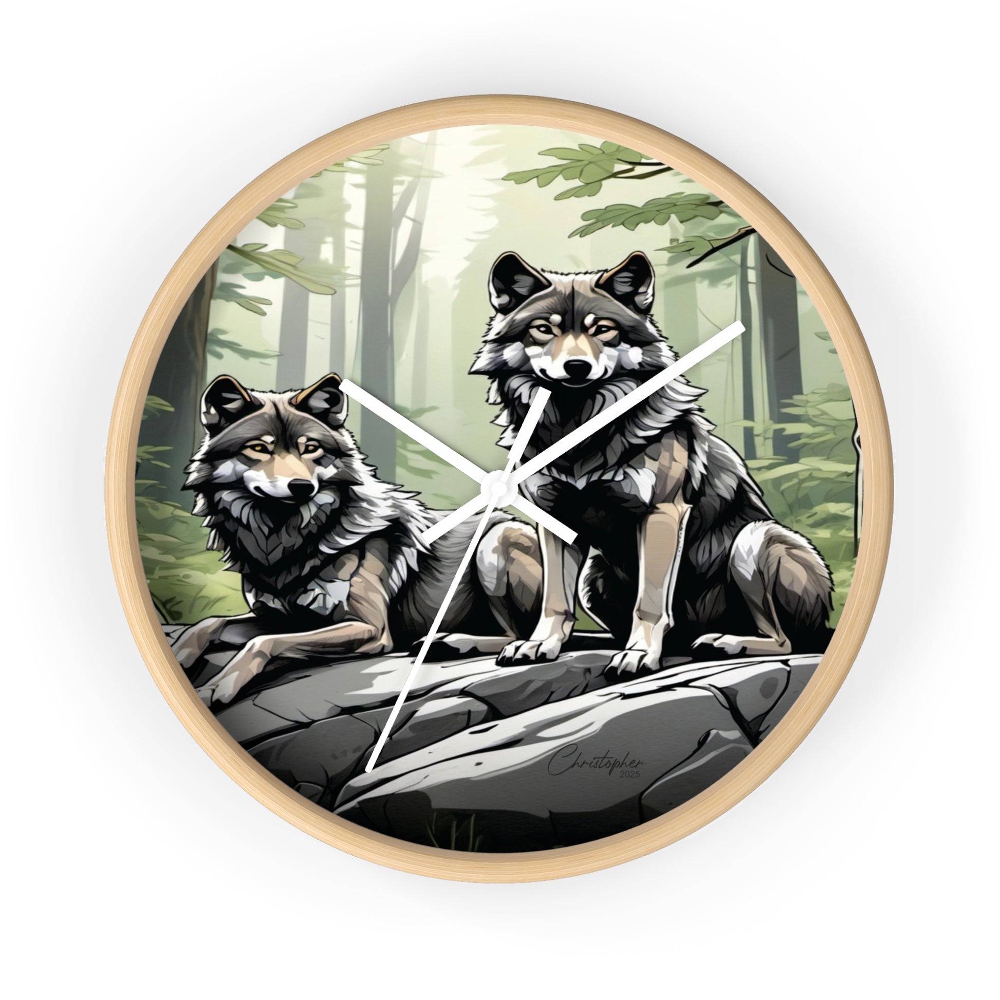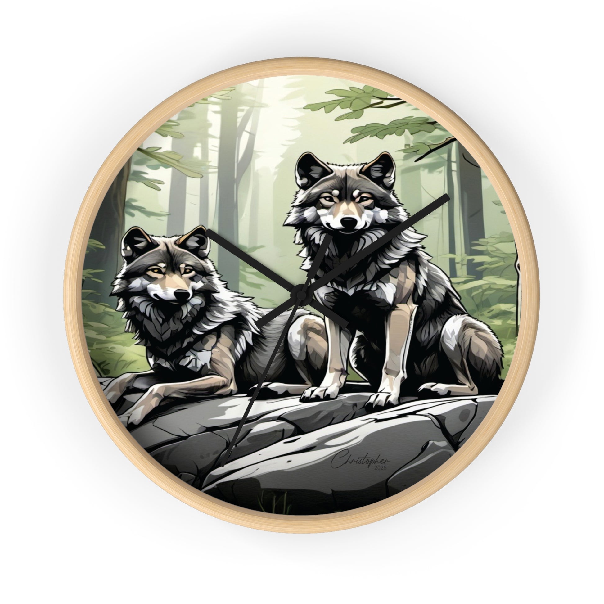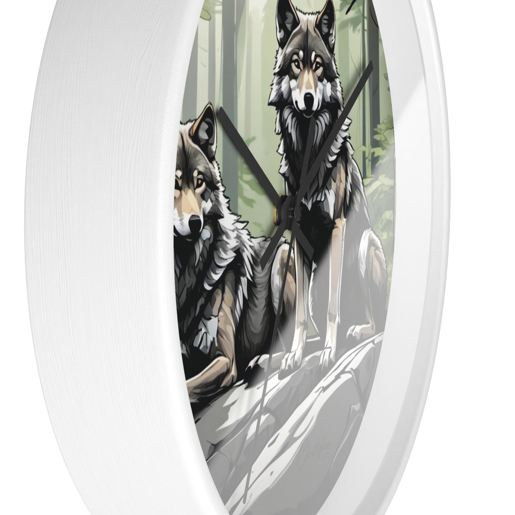 Enhance your living space with this stunning wall clock, designed to make a statement while keeping you punctual. Featuring vibrant artwork of two majestic wolves amid a serene forest backdrop, this clock radiates a cool, tranquil vibe that brings nature indoors. Its rich details and vivid colors create an eye-catching focal point in any room, perfect for nature lovers and wildlife enthusiasts alike. Ideal for decorating your living room, bedroom, or home office, it serves as a wonderful gift for housewarmings, birthdays, or holidays such as Earth Day and Christmas. Its timeless design fits seamlessly into both rustic and modern decor, making it a versatile addition to any home.